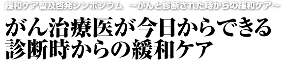 この喫緊の課題に成果を出すべく、昨年度末に引き続き、「がんと診断された時からの緩和ケアの推進」に関する、医療従事者を主対象とするシンポジウムを開催し、この開催の事前から事後を通じて緩和ケアに対する正しい知識の普及、「がんと診断された時からの緩和ケア」の実際の内容について普及と実践の輪を広げることを目指します。